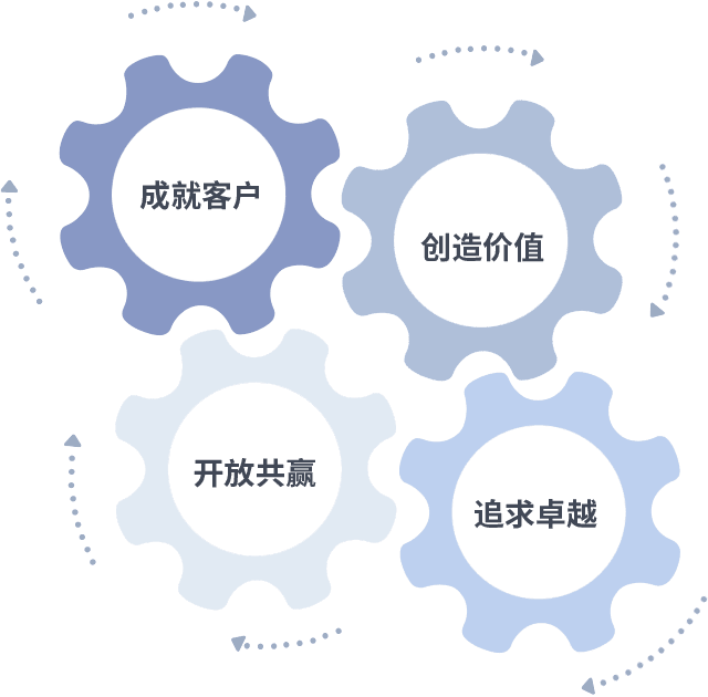 成就客户是一切决策的出发点,,创造价值是衡量所有工作的标准,,追求卓越是我们做事做人的态度,,,,开放共赢是我们的格局也是最终的结果。。。价值观的齿轮环环相扣,,,推动着组织里的每个人不断向前。。。