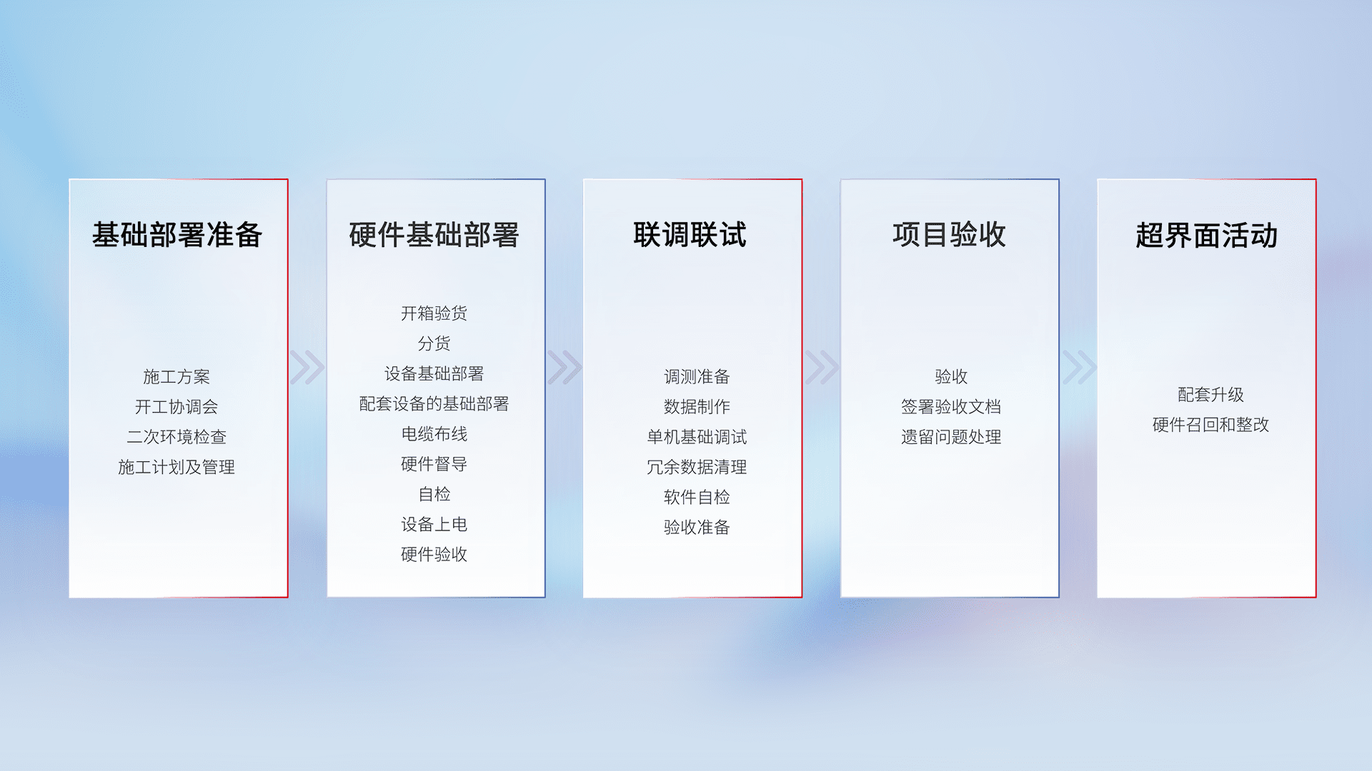从基础部署准备、、、、硬件基础部署、、、、联调联试、、项目验收、、、越界面活动的全过程可追溯,,,,保证施工质量和进度。。。